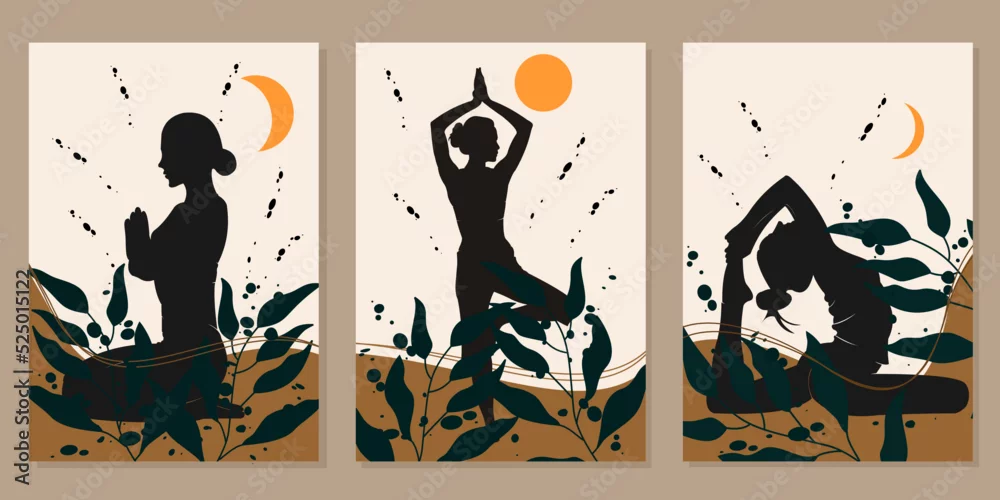 Fototapeta samoprzylepna set of silhouette wall hangings of women posing yoga and abstract leaves. natural background