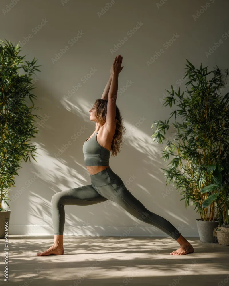 Fototapeta samoprzylepna Woman practicing yoga Warrior pose indoors with potted bamboo plants and sunlight shadows.