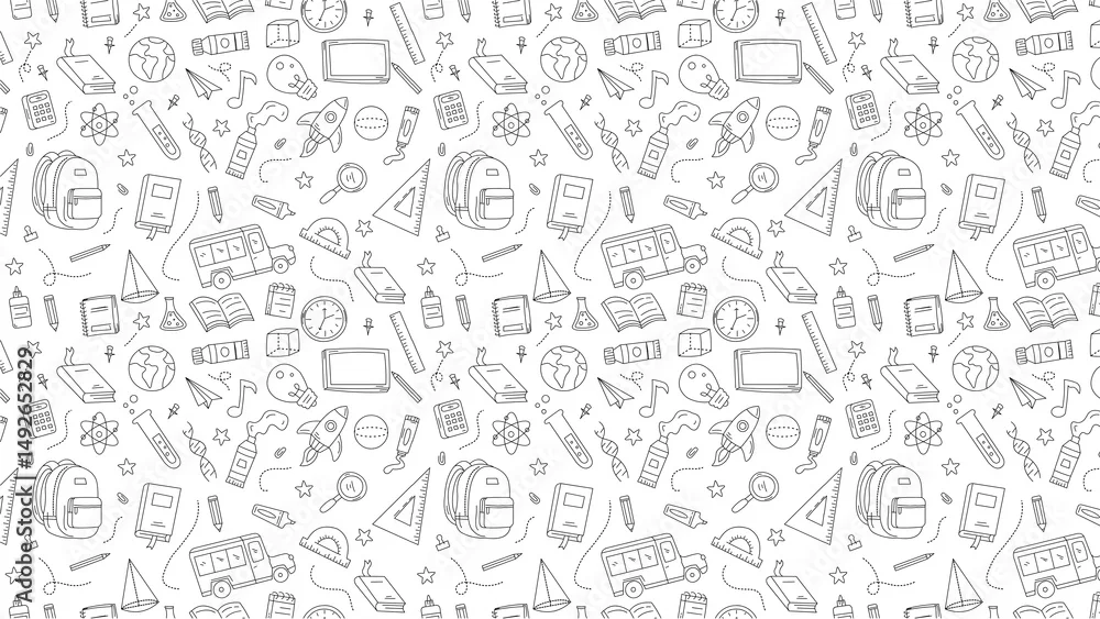 Fototapeta samoprzylepna A seamless pattern of school supplies and educational icons in black and white line art style drawing design