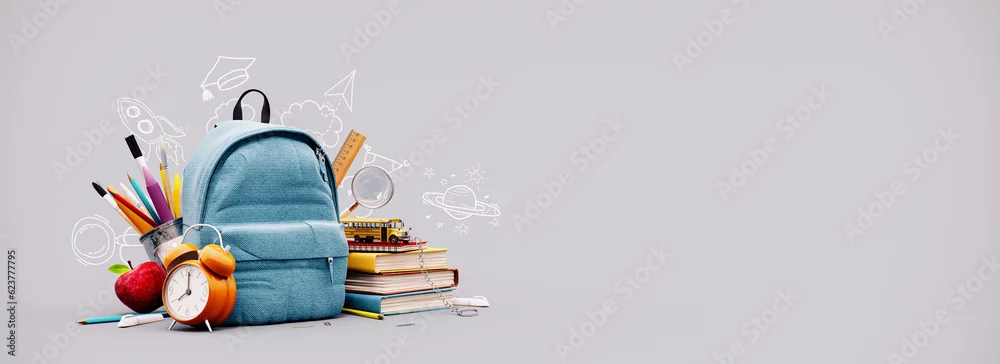 Fototapeta samoprzylepna Blue school bag with books and school accessories on grey background with copy space. 3D Rendering, 3D Illustration