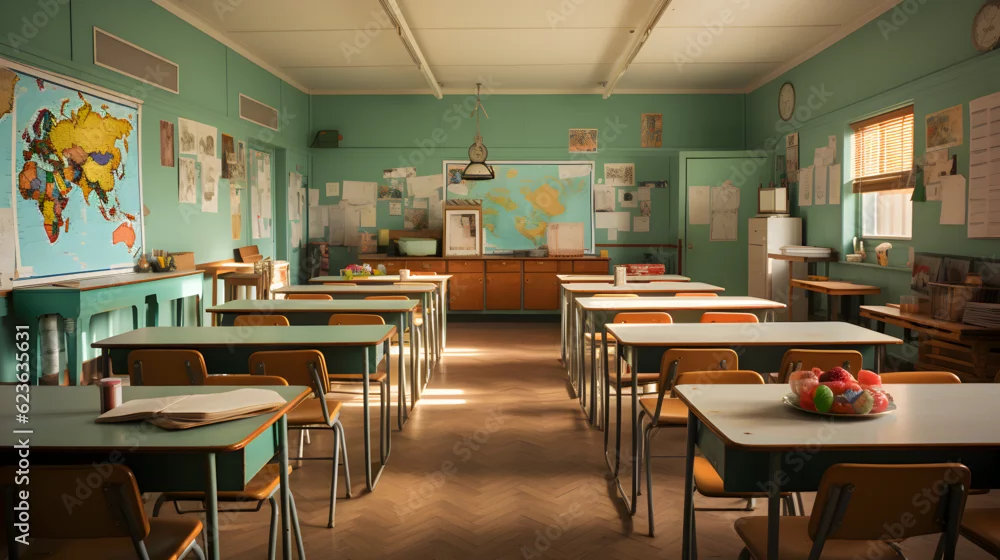 Fototapeta samoprzylepna interior of a traditional style school classroom empty School classroom with desks chair wood greenboard Generative AI