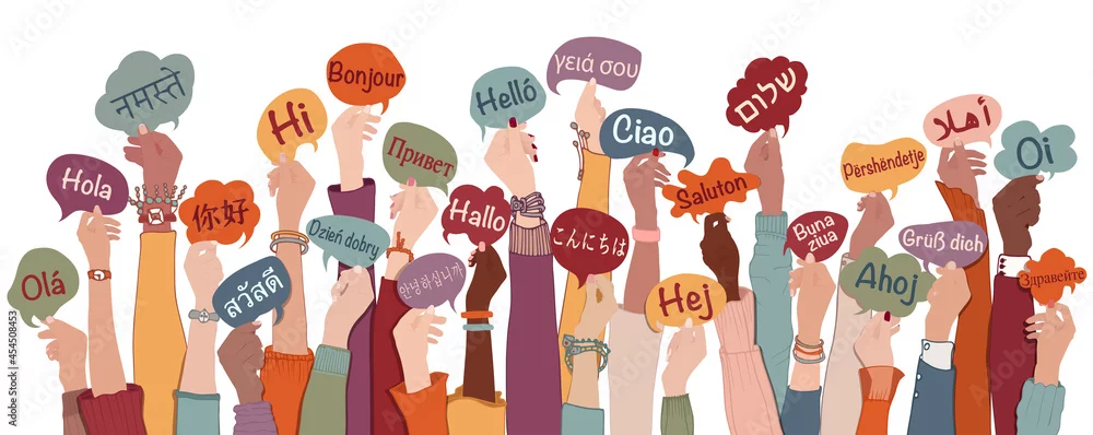 Many arms raised of diverse and multi-ethnic people holding speech bubbles with text -hallo- in various international languages. Diversity people.Racial equality.Sharing and collaboration