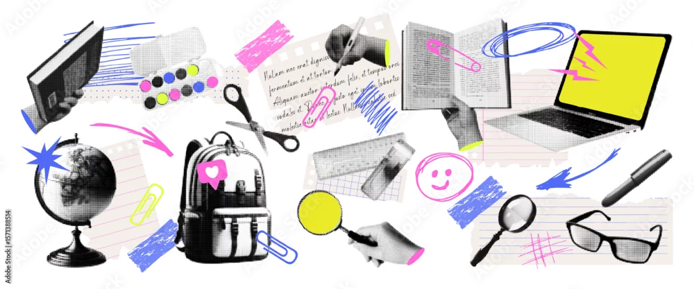 Fototapeta samoprzylepna Trendy education concept halftone collage isolated on transparent background. Elements with paper cut outs, doodle, laptop, school supplies back, globe, books. Vector illustration.