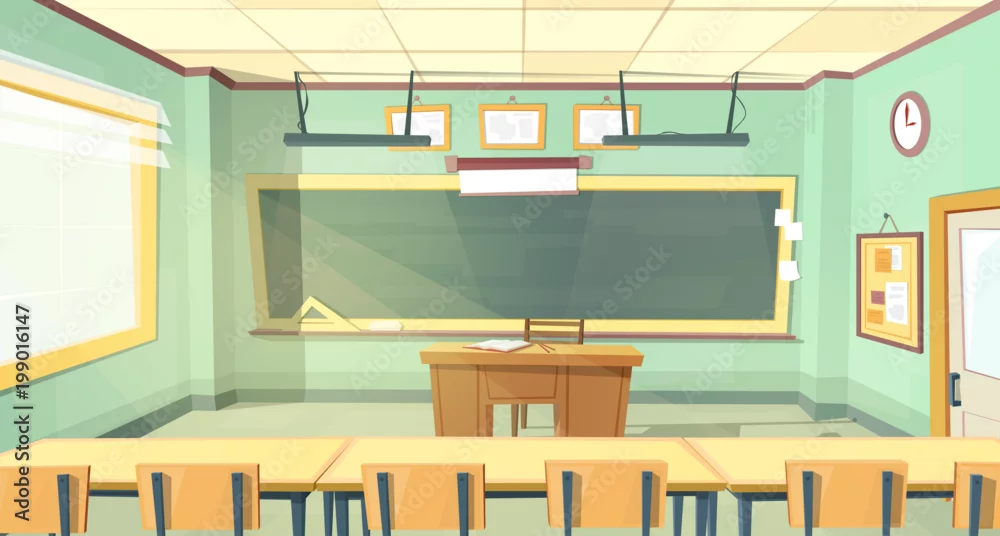 Fototapeta samoprzylepna Vector cartoon background with empty classroom, interior inside. Back to college concept illustration. High school or university lecture hall with furniture, chalkboard, rows of desks and chairs