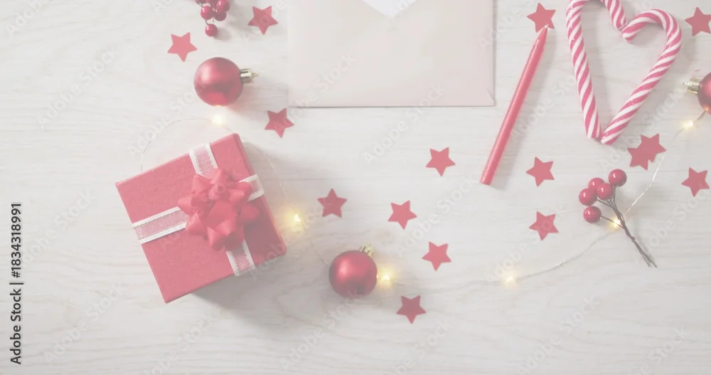 Fototapeta samoprzylepna Displaying red box with white ribbon and bow on pale wood tabletop, featuring candy cane heart