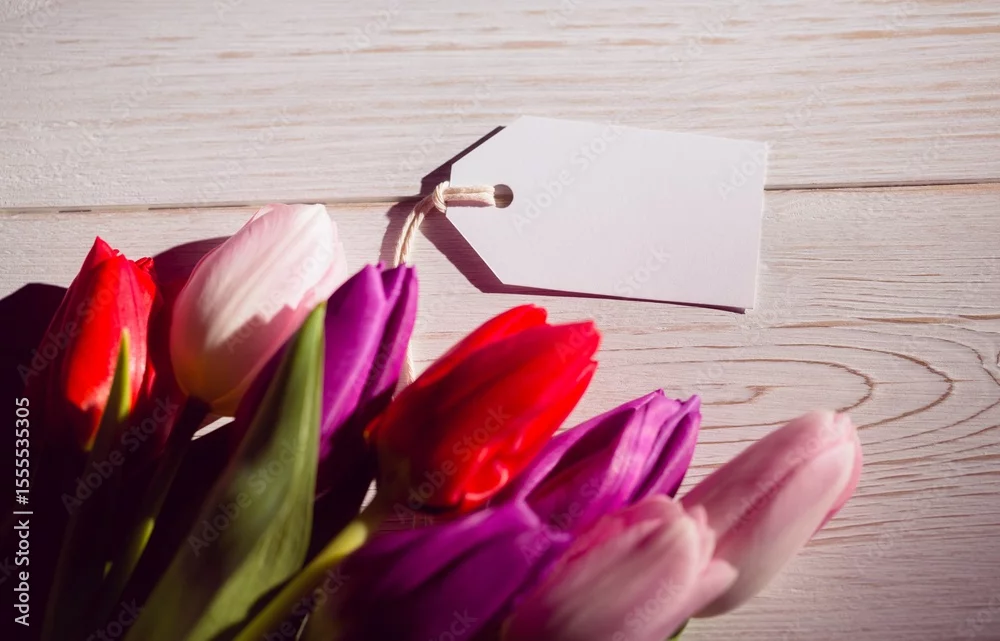 Fototapeta samoprzylepna Presenting flat tulip bouquet red pink purple on wood table, white gift tag hanging on string