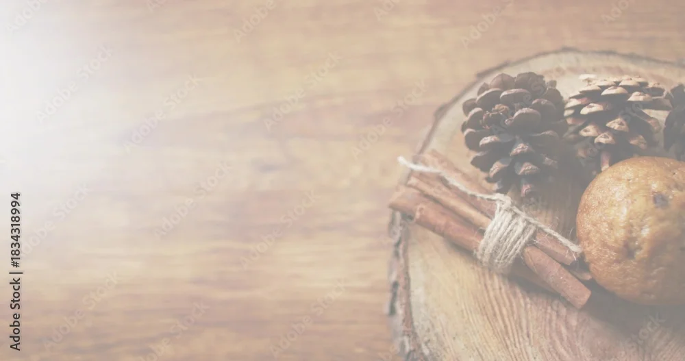 Fototapeta samoprzylepna Showing rustic wood slice on right table with cones, twine-tied cinnamon stick, cookie, copy space