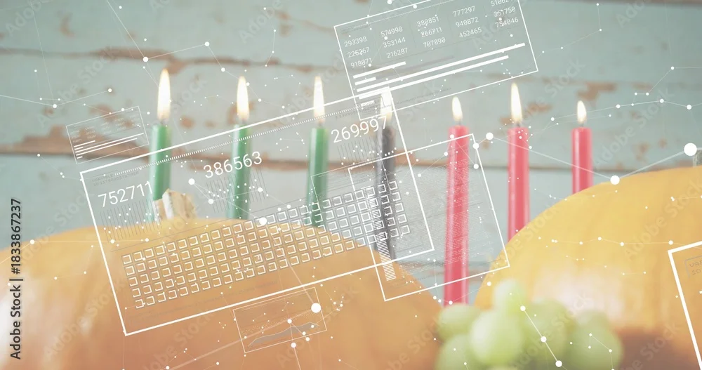 Fototapeta samoprzylepna Showing two pumpkins sitting on wood table with lit candles, grapes, aqua backdrop, HUD overlays