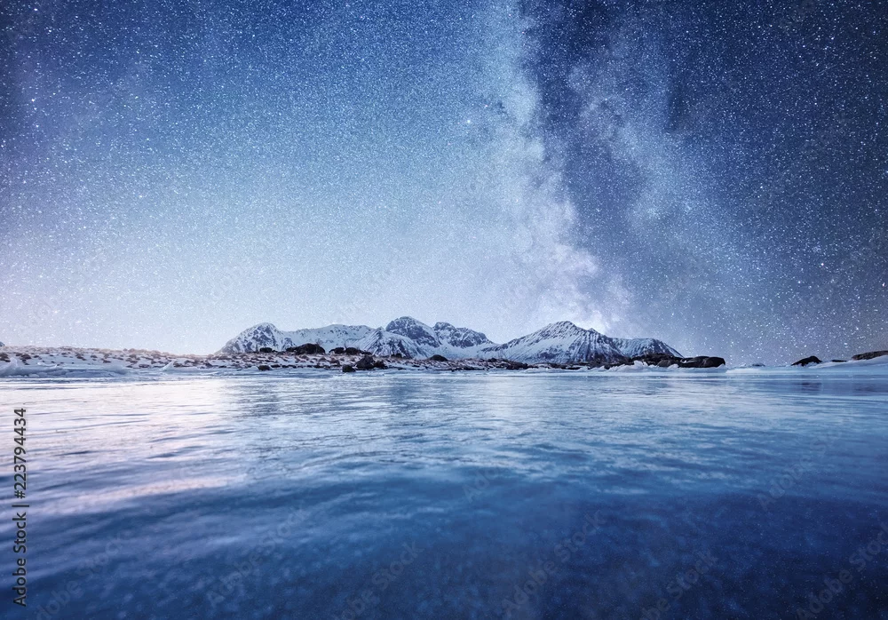 Fototapeta samoprzylepna Mountans i odbicie na powierzchni wody w nocy. Zatoka morska i góry w nocy. Droga Mleczna nad górami, Norwegia. Piękny naturalny krajobraz w Norwegii
