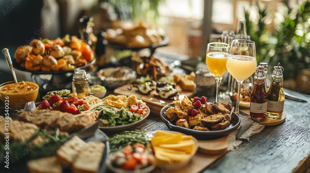 Fototapeta samoprzylepna A table laden with various foods including fruits cheeses and pastries with drinks in tall glasses