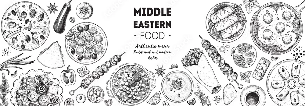 Fototapeta samoprzylepna Arabic food top view frame. Food menu design. Vintage hand drawn sketch vector illustration. Arabian cuisine frame. Middle eastern food.
