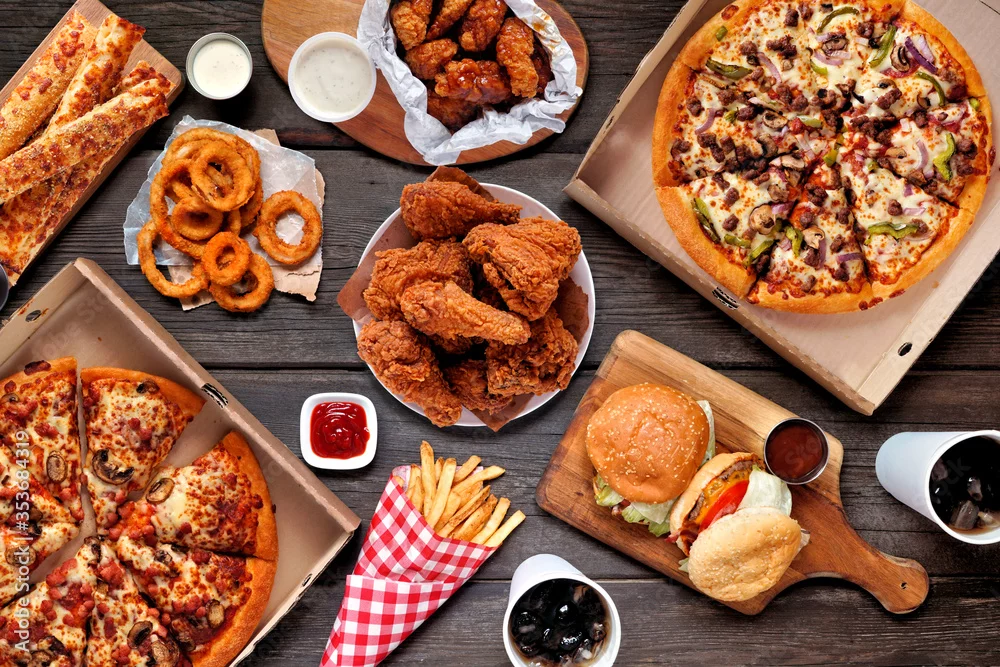 Buffet table scene of take out or delivery foods. Pizza, hamburgers, fried chicken and sides. Above view on a dark wood background.