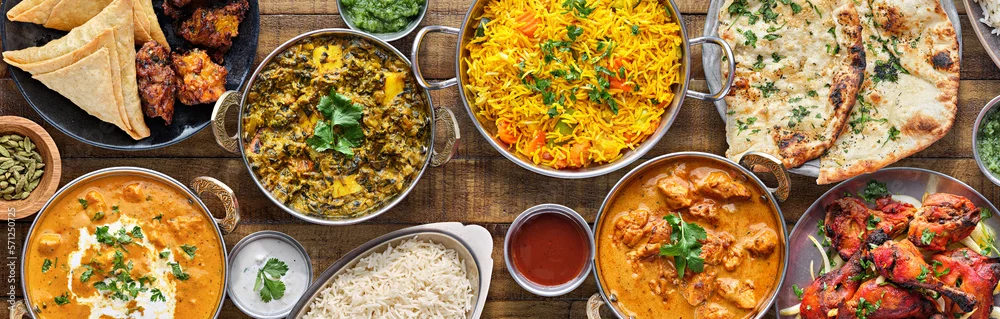 Fototapeta samoprzylepna indian food feast with chicken tikka masala curry, tandoori chicken and appetizers - jedzenie - Picturewall.pl
