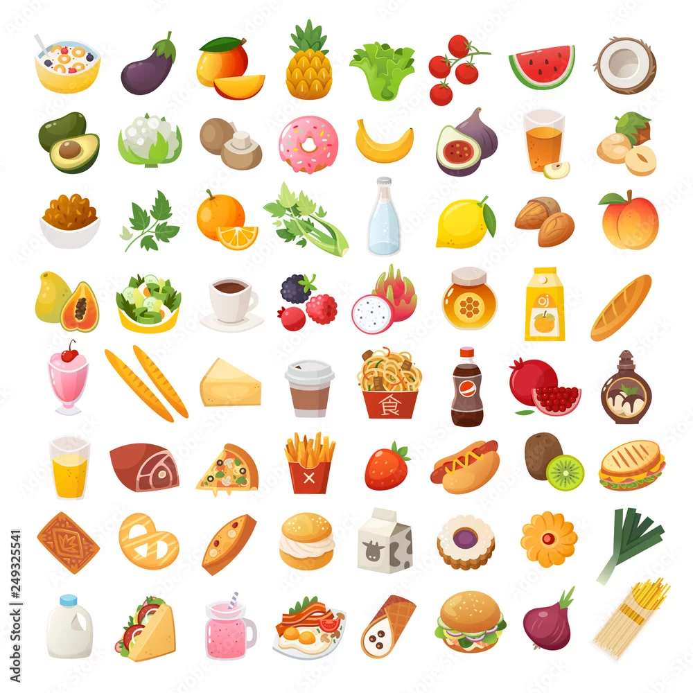 Set of colorful food icons. Bakery, dairy food, fruit and vegetables. Desserts fast food and pasta images. Isolated vector cartoon icons on white background.
