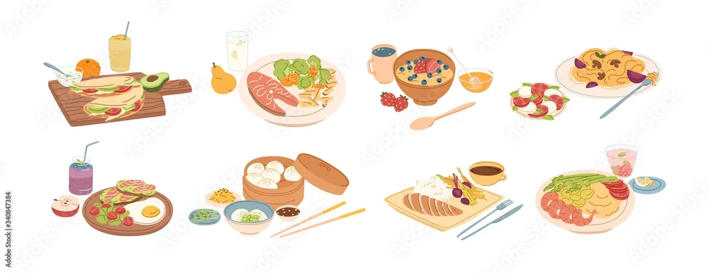 Set of different breakfast, lunch and dinner isolated on white background. Collection of cartoon appetizing fresh food and drink vector graphic illustration. Tasty colorful serving dish