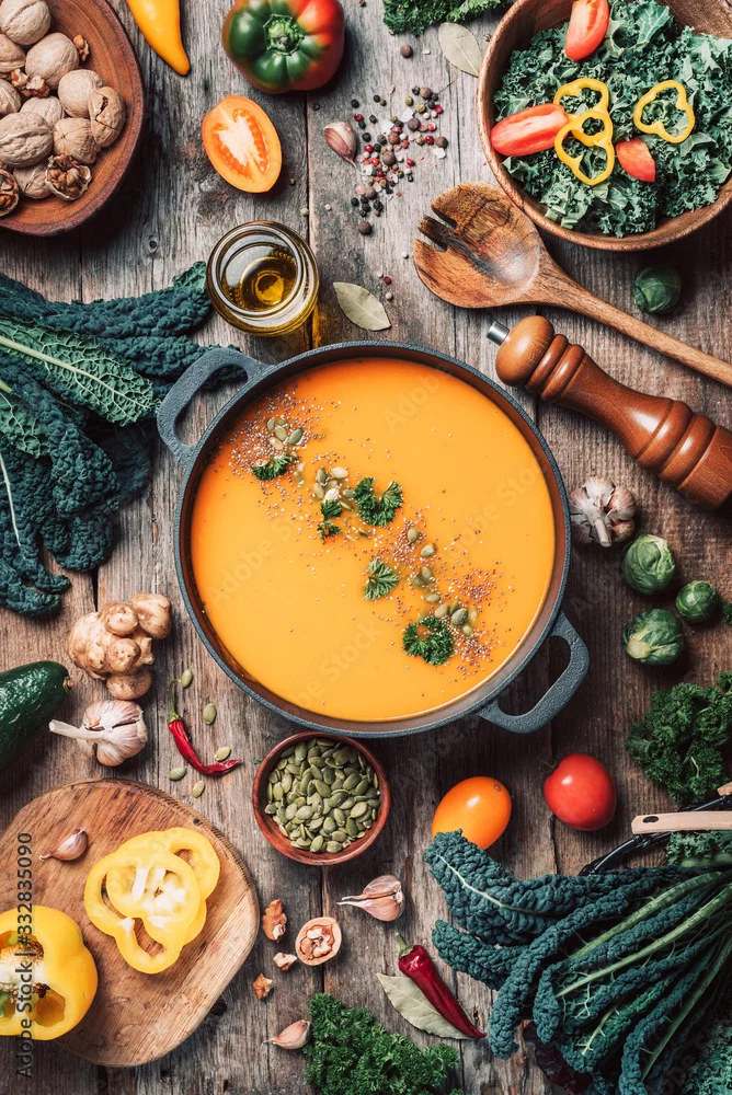 Fototapeta samoprzylepna Vegan diet. Autumn harvest. Healthy, clean food and eating concept. Zero waste. Pumpkin soup with vegetarian cooking ingredients, wooden spoons, kitchen utensils on wooden background. Top view