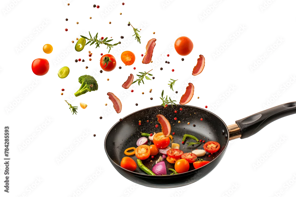 Fototapeta samoprzylepna Vegetables fall into a black frying pan on a transparent background. Healthy food concept