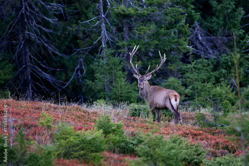 A large male of stag stay at the edge of large spruce forest in autumn after sunset during ruting season. Photographed after sunset in low natural light and high ISO.