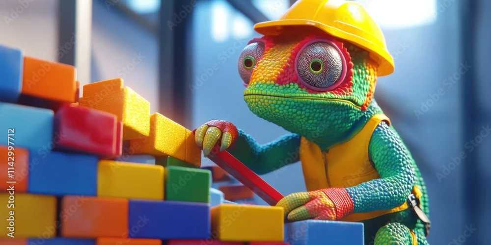 A chameleon wearing a hard hat and vest constructs a wall with brightly colored blocks at a lively construction site under bright lighting. Generative AI