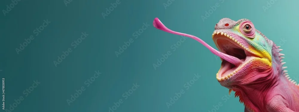 Fototapeta samoprzylepna Advertising banner with funny pink chameleon with tongue sticking out in time to hunt on blue background with copy space.