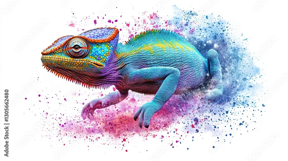 Fototapeta samoprzylepna An isolated chameleon with a multicolor powder paint explosion around it, on a transparent background
