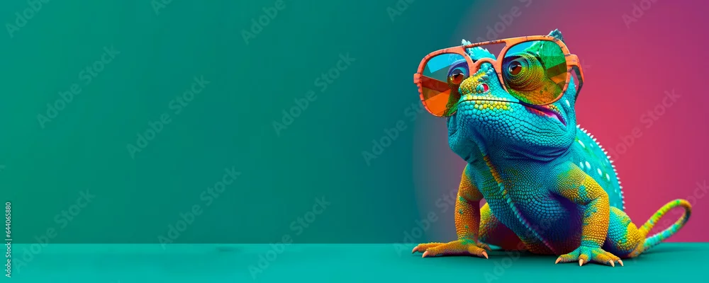 Fototapeta samoprzylepna chameleon wearing sunglasses on a solid color background, vector art, digital art, faceted, minimal, abstract, panorama background. Generative AI.