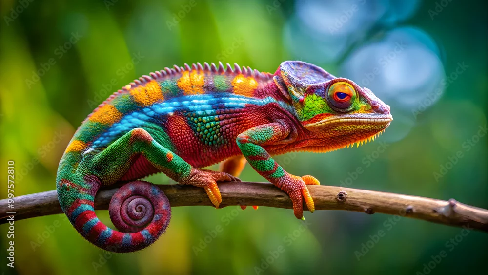 Fototapeta samoprzylepna Colourful chameleon on a branch, midjourney, generative, ai, chameleon, colourful, branch, journey, nature - kameleony - Picturewall.pl