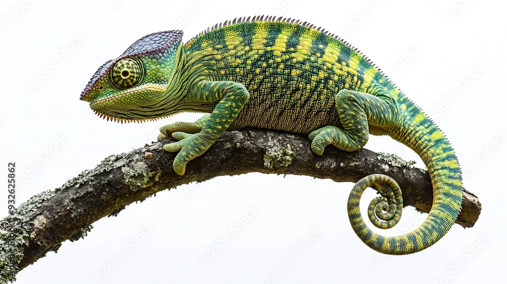 Isolated on white background Bright green Parsons chameleon Calumma parsonii huge colourful chameleon climbing up tree branch curled tail Wild animal Madagascar : Generative AI