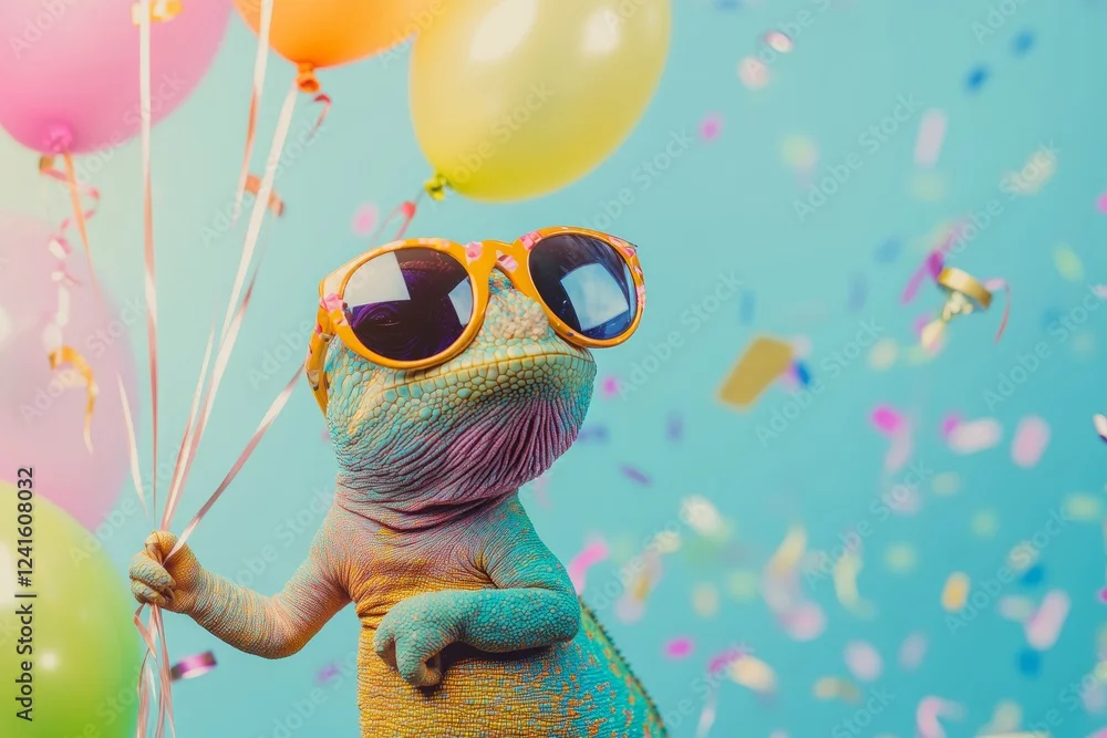 Vibrant chameleon with sunglasses holding birthday balloons against pastel blue background, perfect for birthday party or celebration themes