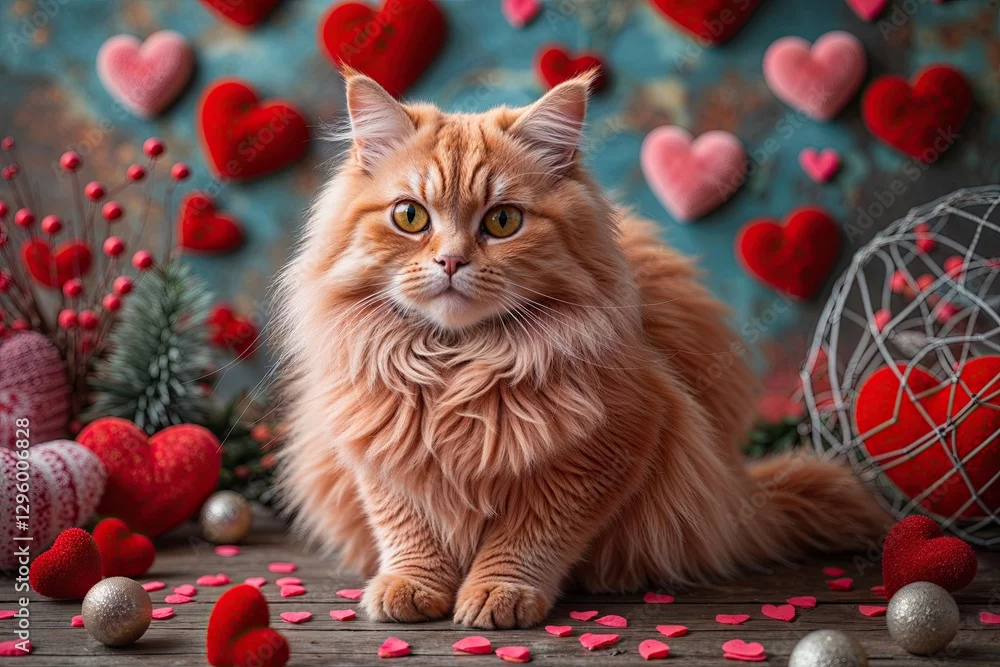 Fototapeta samoprzylepna Charming Fluffy Coral Cat on a Whimsical Background for Valentine's Decor