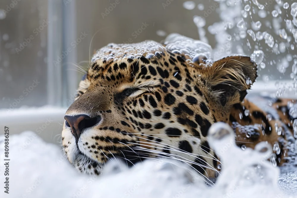 Fototapeta samoprzylepna Close-up leopard grooming spots bath relax enjoy water soak foam bubbles wildlife nature wild big cat feline soap cleanse rinse splash