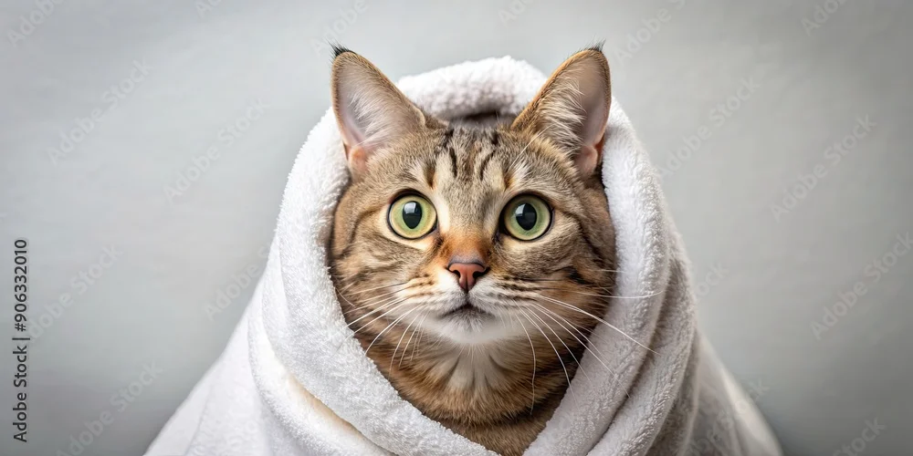 Fototapeta samoprzylepna Funny surprised cat wrapped in towel after shower, cat, funny, surprised, towel, shower, pet, animal, cute, domestic, feline