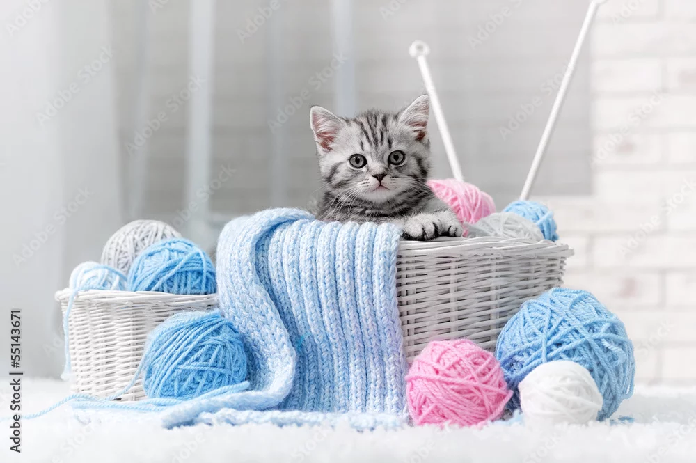 Fototapeta samoprzylepna Kitten in a basket with balls of yarn