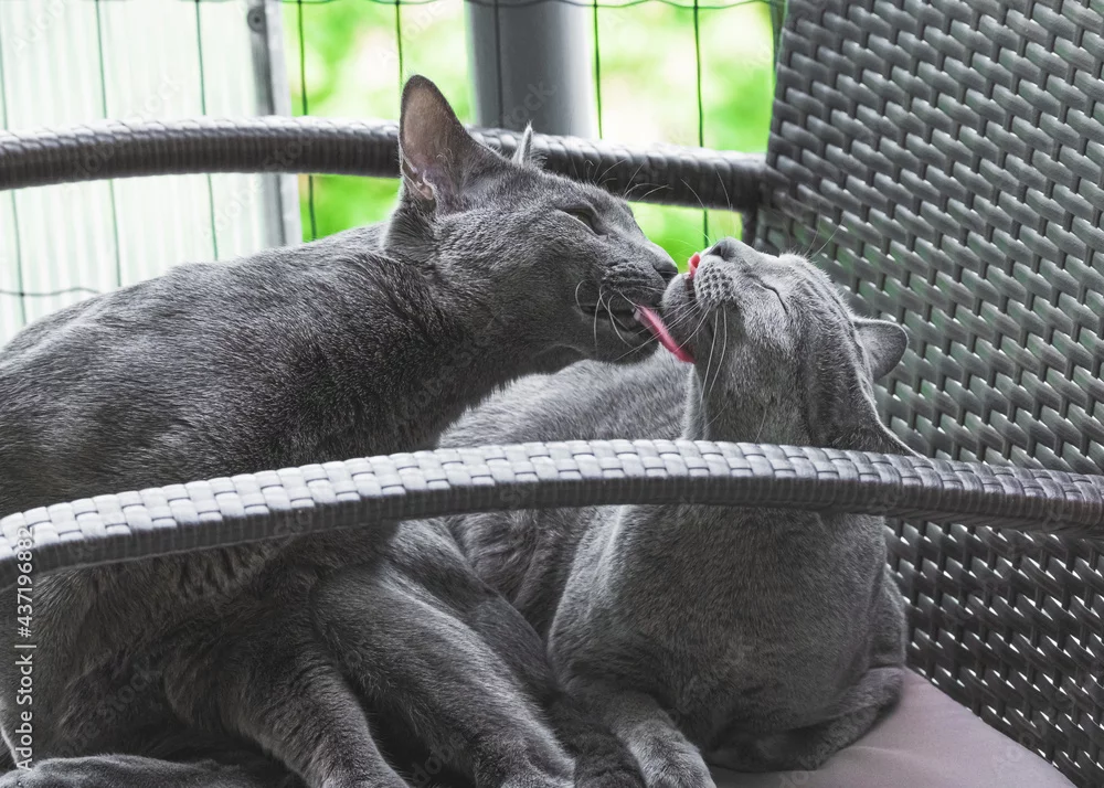 Fototapeta samoprzylepna Myjące się koty rosyjskie niebieskie