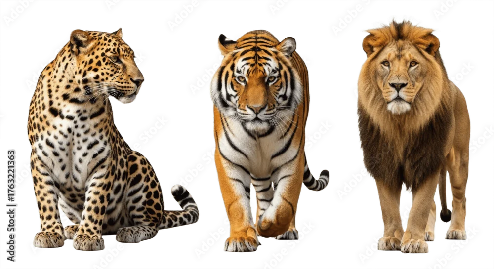 Fototapeta samoprzylepna Set of Three Big Cats – Leopard, Tiger, and Lion Isolated on White Background – Powerful Wild Predators from African and Asian Wildlife Showcasing Strength, Elegance, and Majestic Feline Beauty