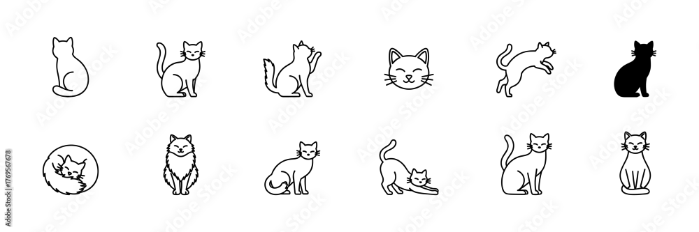 Fototapeta samoprzylepna Set of twelve simple line drawings of cats in various poses