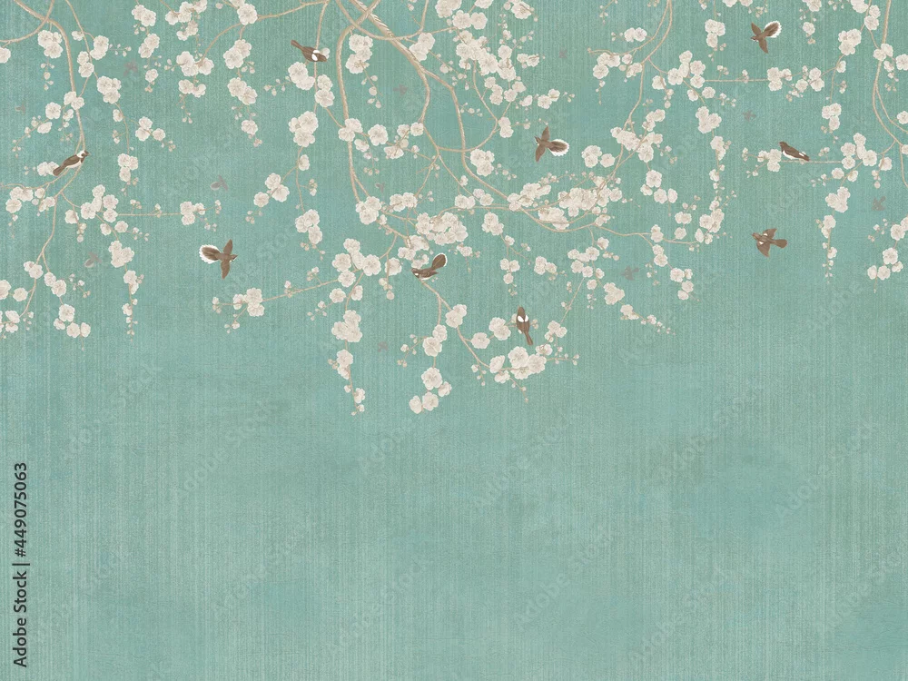 Fototapeta samoprzylepna gałęzie z kwiatami i ptakami w stylu vintage na zielonym strukturalnym tle
