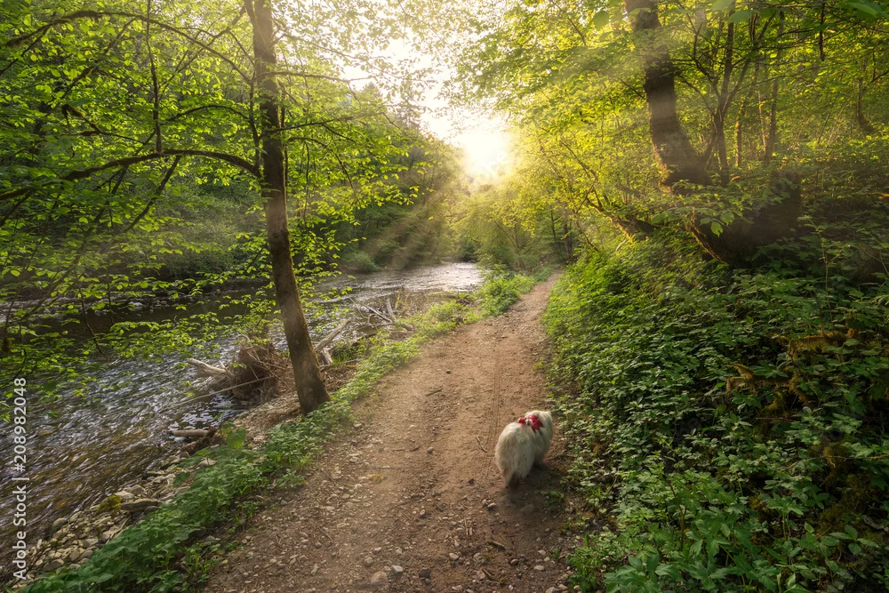 Fototapeta samoprzylepna las i leśna ścieżka z psem o wschodzie słońca