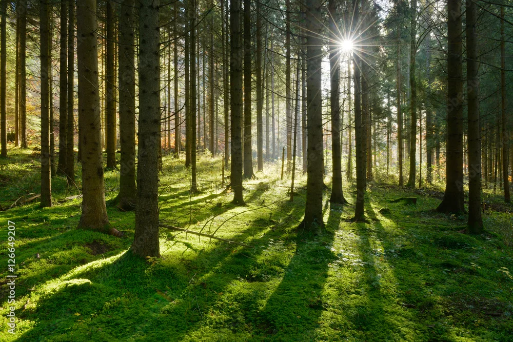 Fototapeta samoprzylepna las świerkowy w ciepłym świetle porannego słońca z dywanem mchu