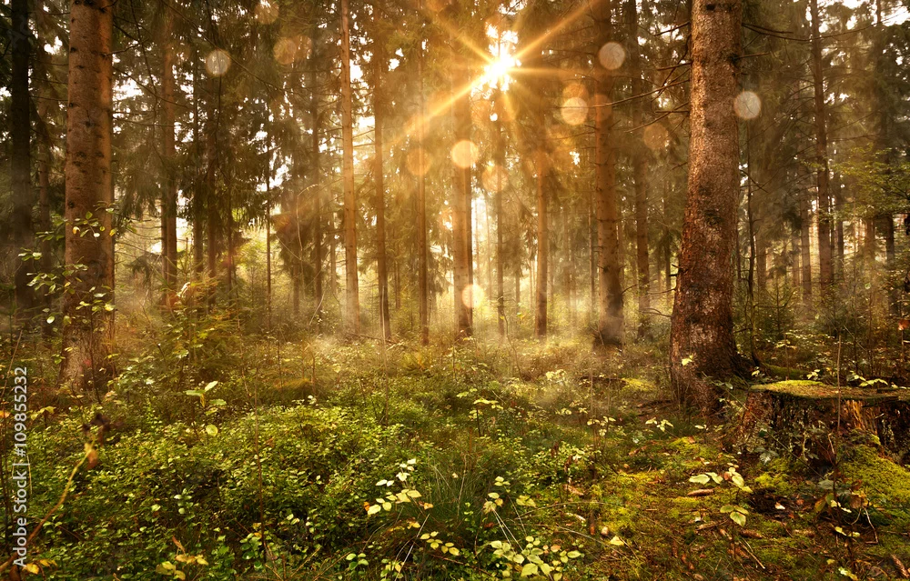 Fototapeta samoprzylepna słońce świecące w lesie pomiedzy drzewami