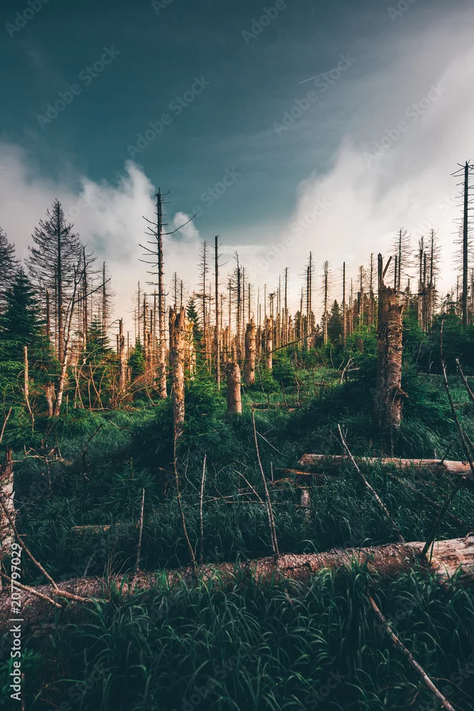Fototapeta samoprzylepna widok na połamane drzewa w lesie