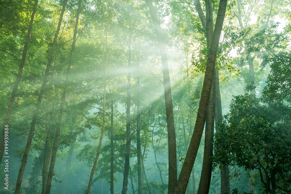 Fototapeta samoprzylepna zieleń lasu i leśne drzewa w promieniach słońca