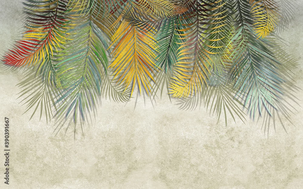 Fototapeta samoprzylepna Kolorowe tropikalne liście zwisające z góry na teksturowanej ścianie.