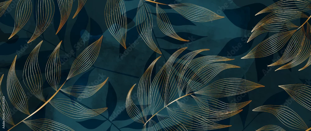 Fototapeta samoprzylepna Luxury abstract dark art background with tropical leaves in gold line art style. Botanical banner with exotic plants for wallpaper design, decor, print, packaging, textile, interior