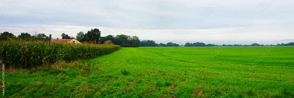 Fototapeta samoprzylepna Piękna panorama zielonego pola we wsi, z domem po lewej i lisem biegnącym po polu, w tle drzewa tworzące spokojny krajobraz.