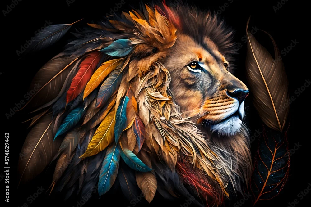 Fototapeta samoprzylepna Portret lwa z kolorowymi piórami. Wygenerowane przez sztuczną inteligencję