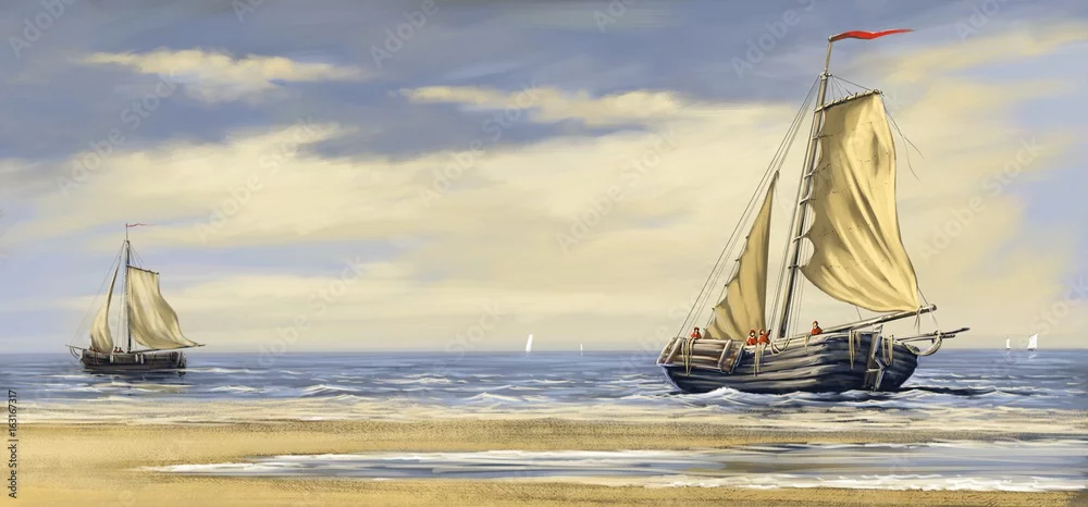 Fototapeta samoprzylepna Krajobraz morski, łodzie i statki, tło, obrazy olejne, sztuka cyfrowa