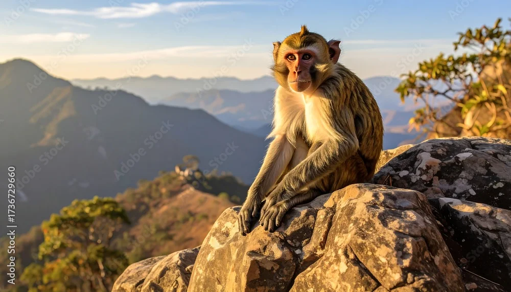 Fototapeta samoprzylepna A monkey sits serenely on a rocky summit, overlooking a vast mountain range bathed in golden light. - małpy - Picturewall.pl