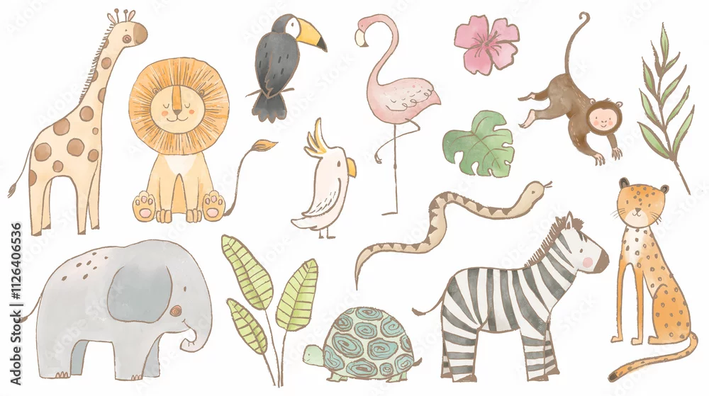 Fototapeta samoprzylepna Beautiful stock illustrations set with cute lion zebra toucan elephant monkey flamingo. Safari animal clip art. Isolated naive style drawing. Childish hand drawn painting.