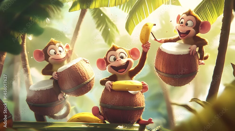 Fototapeta samoprzylepna Playful monkeys playing musical instruments in a tropical setting.